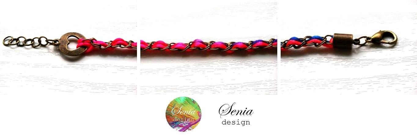 z satynowych sznurków, wielokrotnie przeplatających łańcuszki w kolorze starego złota, ozdobione uroczymi dodatkami. Let's fluo!!!
